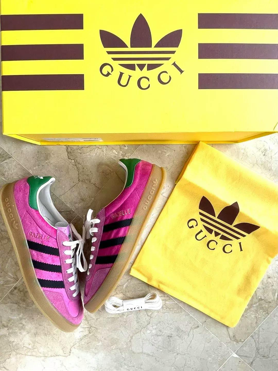 Iâm absolutely in love with these Adidas x Gucci sneakers! The green and pink color combo is bold but still feminine â Iâve gotten so many compliments every time I wear them. They're super comfy right out of the box, with a nice balance of sporty and luxe. Perfect for dressing up a casual outfit or adding flair to something more edgy. A must-have if you're into statement pieces. Worth every penny!